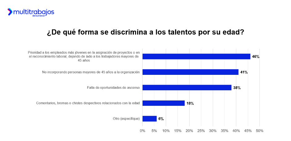 ¿Cómo se manifiesta la discriminación por edad en su trabajo? El 46% menciona que se prioriza a los empleados más jóvenes en la asignación de proyectos o en el reconocimiento laboral; el 41% indica que no se incorporan personas mayores de 45 años a la organización y el 38% señala la falta de oportunidades de ascenso.