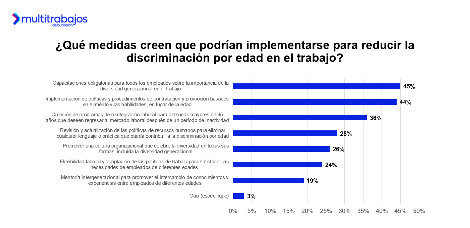 ¿Qué medidas sugieren para reducir la discriminación por edad en el trabajo? El 45% de los talentos sugiere capacitaciones obligatorias para todos los talentos sobre la importancia de la diversidad generacional en el trabajo; el 44% propone la implementación de políticas y procedimientos de contratación y promoción basados en el mérito y las habilidades, en lugar de la edad; y el 36% menciona la creación de programas de reintegración laboral para personas mayores de 45 años que deseen volver al mercado laboral después de un período de inactividad.