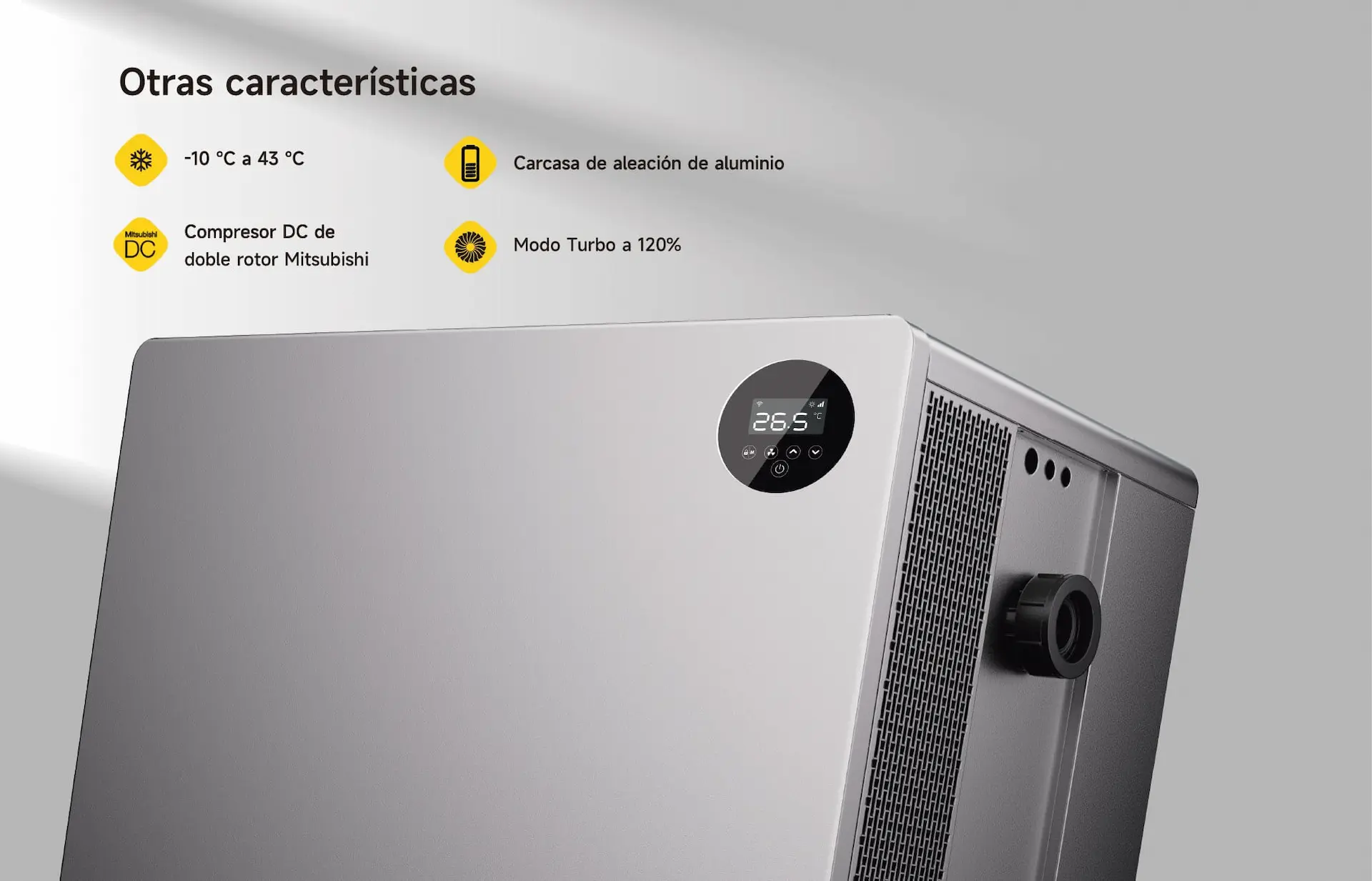 TECNOLOGÍA: Este sistema incorpora tecnología Inverter de última generación, equipada con un chip inteligente que analiza en tiempo real las condiciones climáticas del entorno. En climas cálidos, el equipo aprovecha al máximo el calor ambiental, optimizando su rendimiento y reduciendo el consumo eléctrico. De esta manera, adapta su funcionamiento para ofrecer siempre la mayor eficiencia energética posible, sin comprometer el confort del usuario.