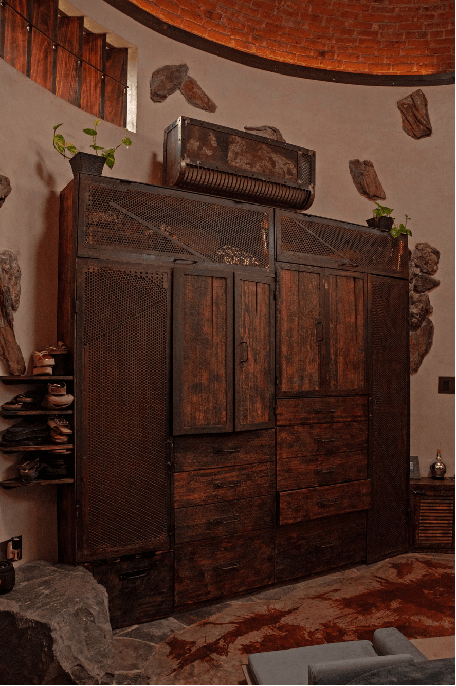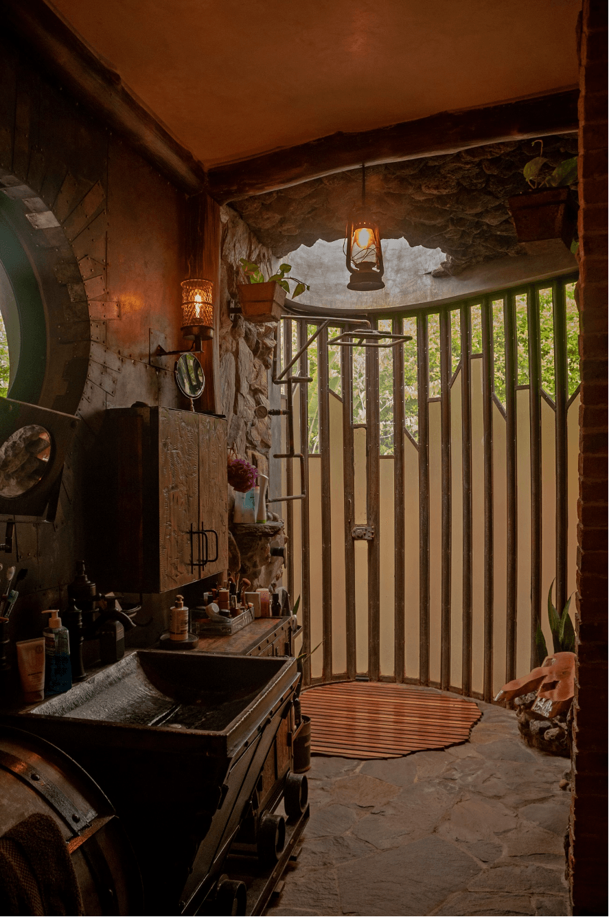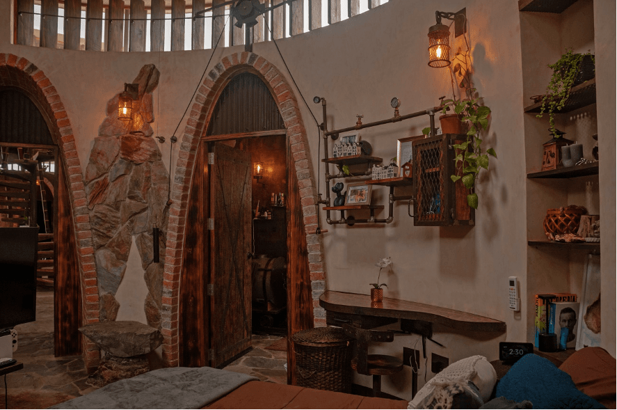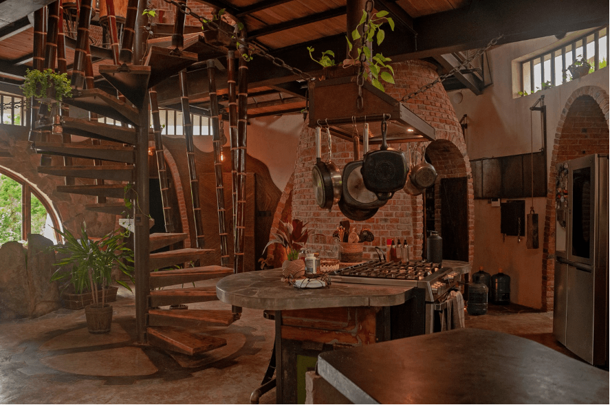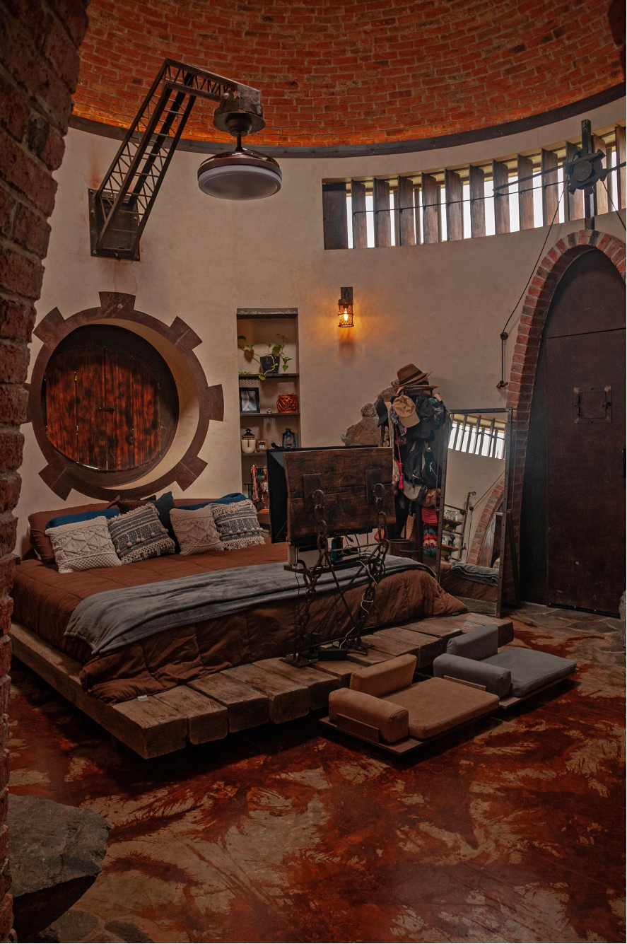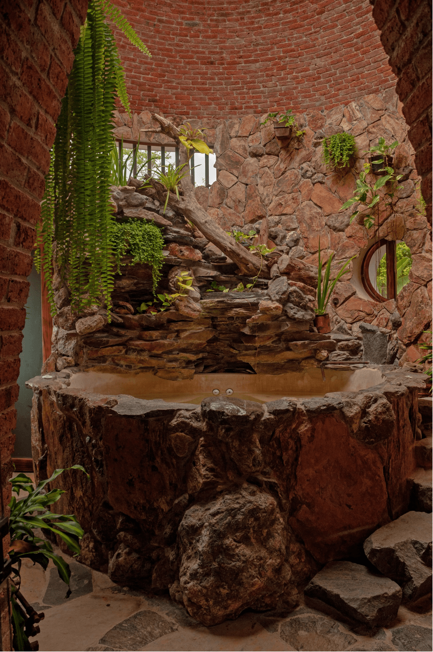 Es importante destacar la forma constructiva. Hiperadobe, el cual usa los recursos de la tierra ya que el 80% de las paredes es tierra compactada, con un grosor de 50cms. Gracias a esto las temperaturas en la casa se mantiene, contamos además con pozos canadienses, los cuales inyectan aire frio a la casa atreves de un sistema subterráneo de tuberías. La casa está pensada con el manejo de temperaturas de aire, ya que el aire más frio queda por debajo expulsando por los skylites el aire caliente. Cabe recalcar la adicion de techos verdes que ayudan con los cambios de temperatura.