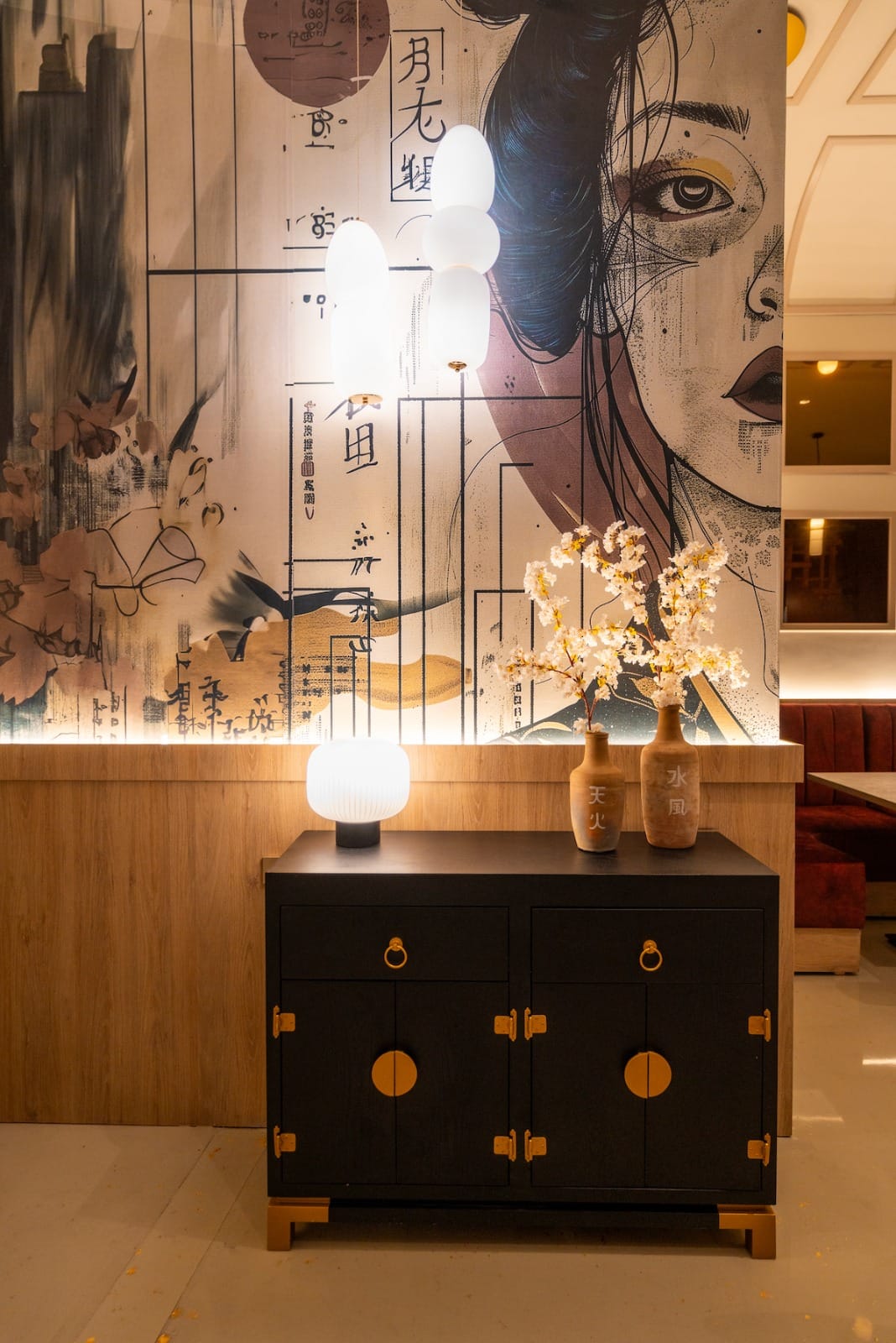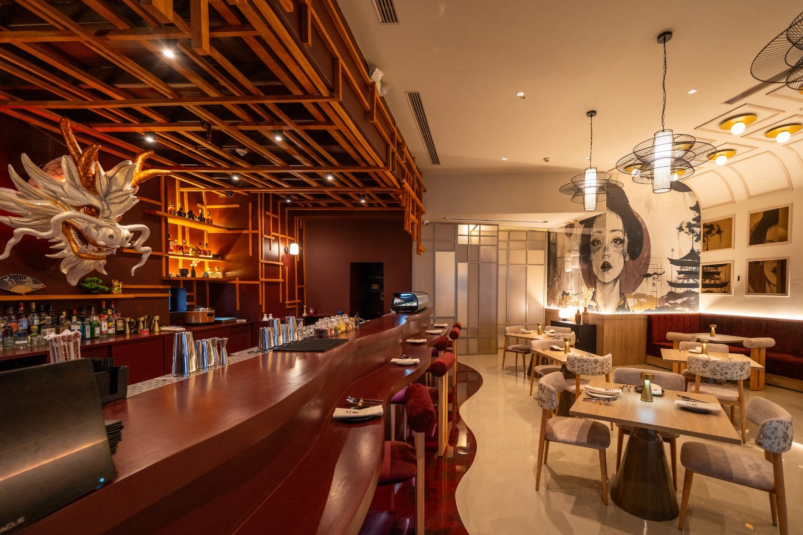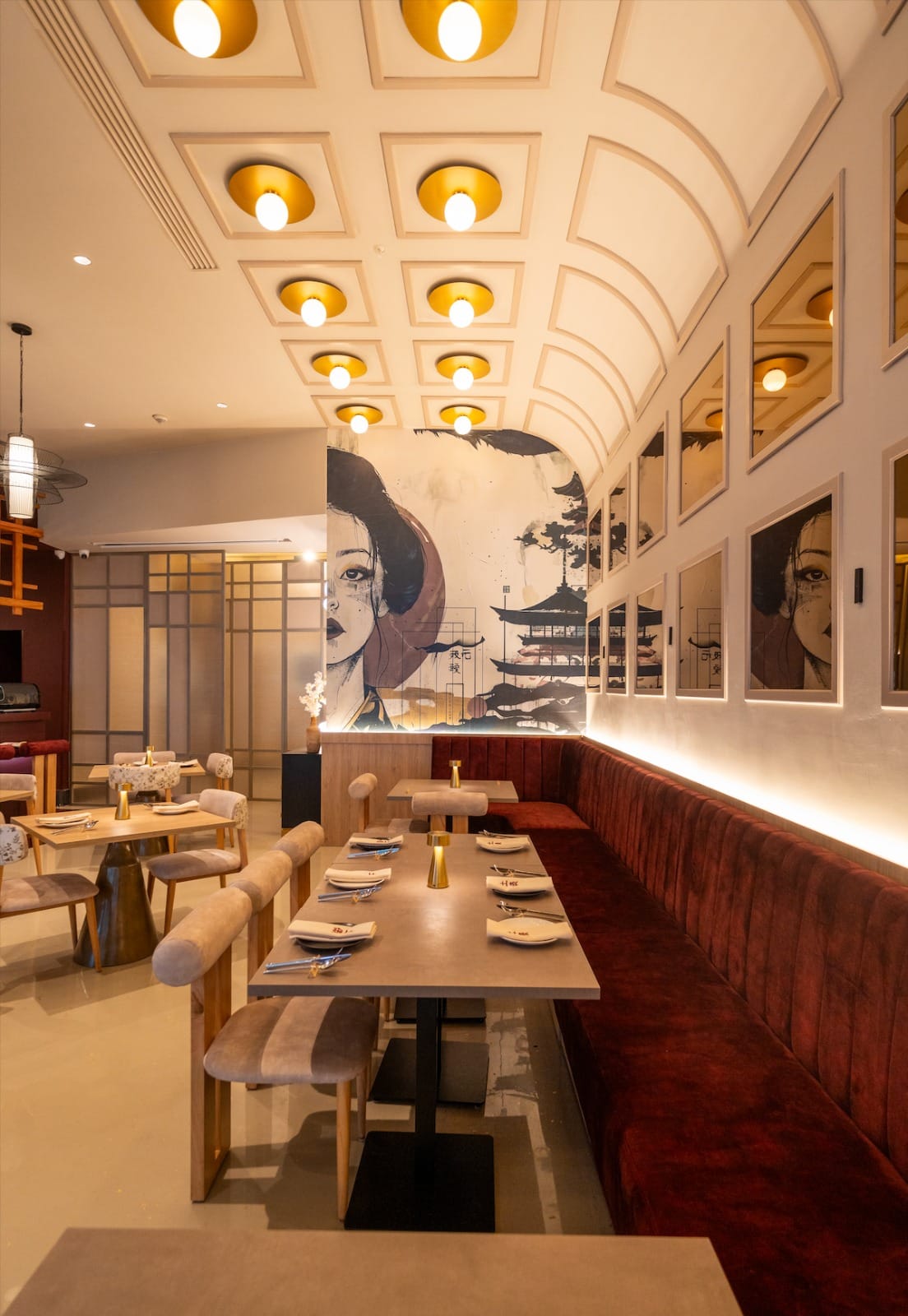 Basado en la arquitectura japonesa con un toque moderno y elegante, diseñe Doyo con la idea de crear un ambiente  acogedor y sobretodo dinámico. Con detalles en madera propios de la cultura japonesa y una paleta de colores contrastantes, zonifique el espacio de la barra y bar con el tono vino y resalte el area de los comensales con tonos mas neutral entre beige y dorado. Se delimito el espacio incluso en el piso aplicando resina en los tonos designados por area. El uso de la iluminación cálida con detalles en luces led entre rojo y morado acentuaron cada detalle en este proyecto. El espacio debía de cierta manera fusionarse o combinar y a la vez destacar sobre el area de transito que atraviesa la zona de las mesas ya que se encuentra en el lobby del hotel Wyndham de puerto santa ana, camino al area del restaurante del hotel. El uso de espejos en tono bronce genera amplitud y el detalle del mural japonés aporta personalidad.
