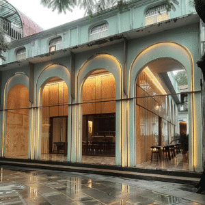· *La fachada de la cafetería fusiona molduras clásicas con acero abrillantado e iluminación led, dejando ver el panelado interior -enchapado en madera de Chopo natural- como parte de la misma.