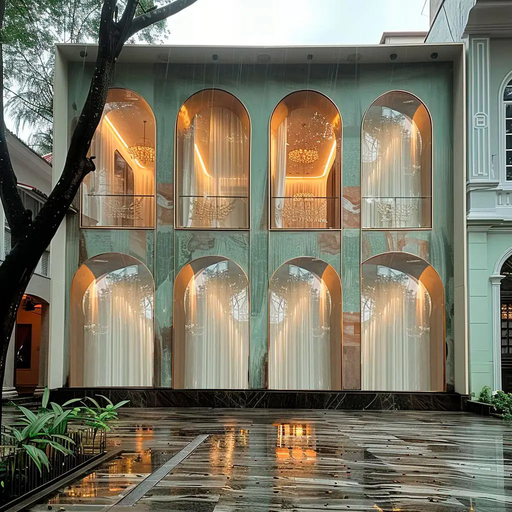 · *La fachada principal (planificada en Piedra de Brasil) corresponde al salón de eventos del hotel.