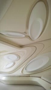 Como innovación tecnológica, se trabajó junto a la empresa Ceneflex para la realización de todos los elementos formales en pared y techo, así como la fachada y aleros de la volumetría. Los mismos, fueron desarrollados de poliestireno expandido de alta densidad, recubiertos con una malla de fibra de vidrio resistente al álcali y una capa de cemento con aditivos especiales. De esta forma, se pudo lograr una gran flexibilidad en la creación de las formas, pero a la vez piezas lo suficientemente ligeras para que no supusieran cargas significativas adicionales a la estructura.
