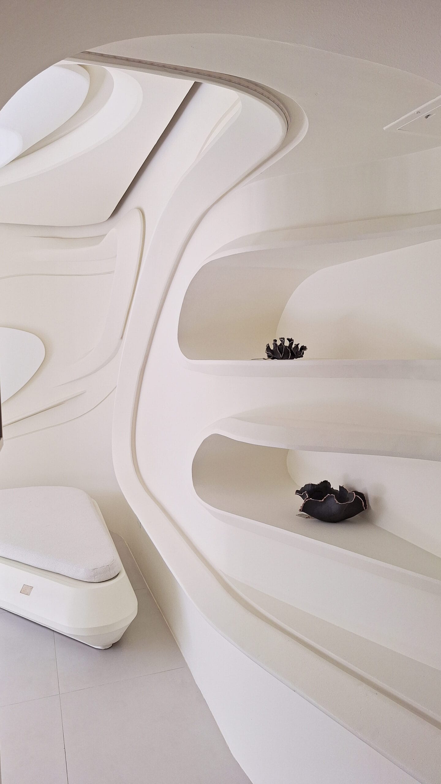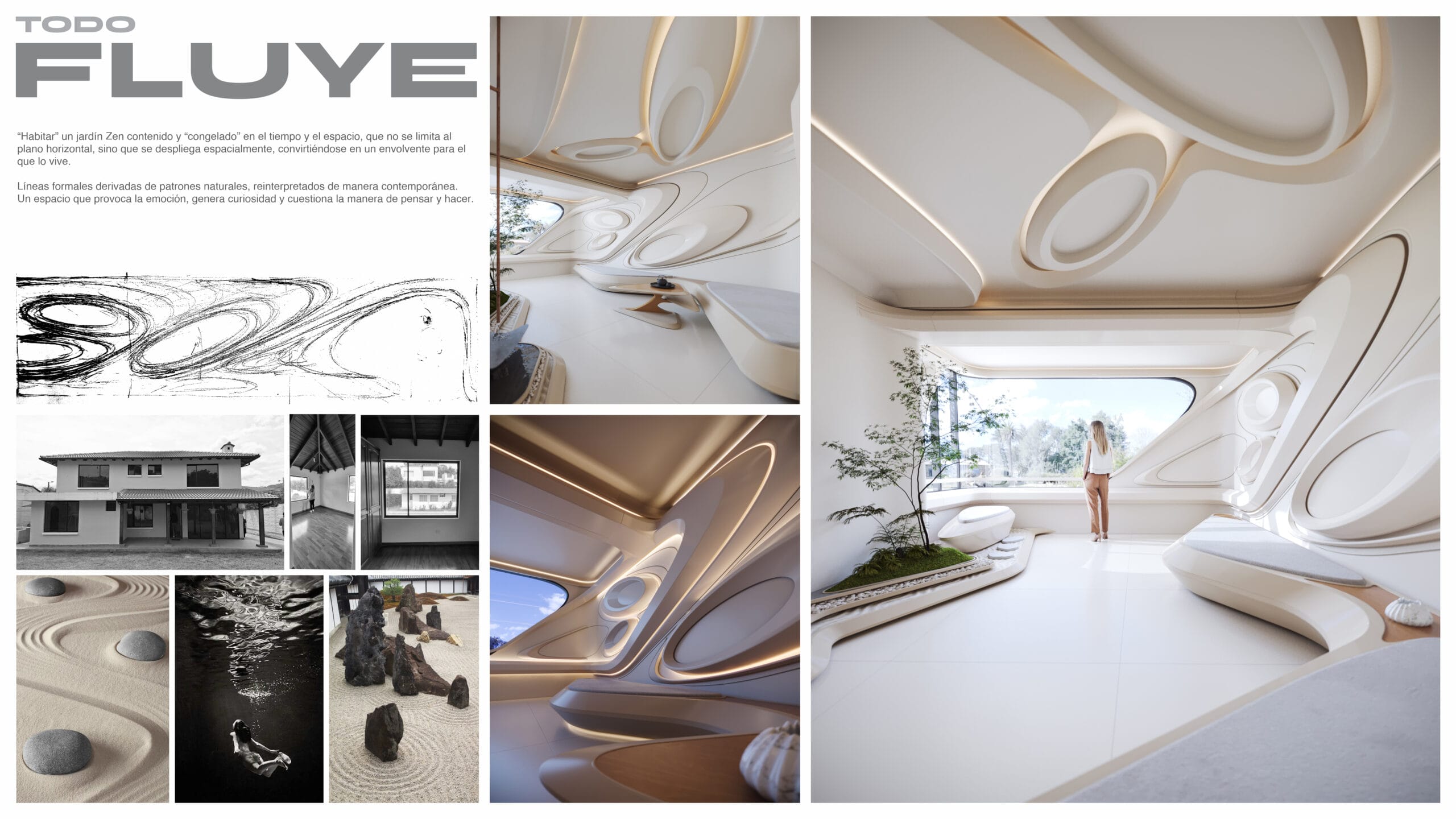 Haciendo alusión a la arena rastrillada que caracteriza un jardín Zen, las formas que quedan “congeladas” en el espacio y que lo recorren de manera continua, simulan este elemento y evocan el flujo del agua.